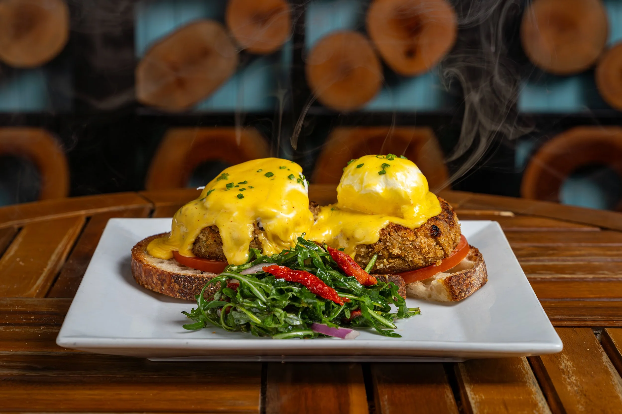Two patties, cheddar cheese & bacon topped with an over medium egg & drizzled with hollandaise sauce, served over our bakery white toast.